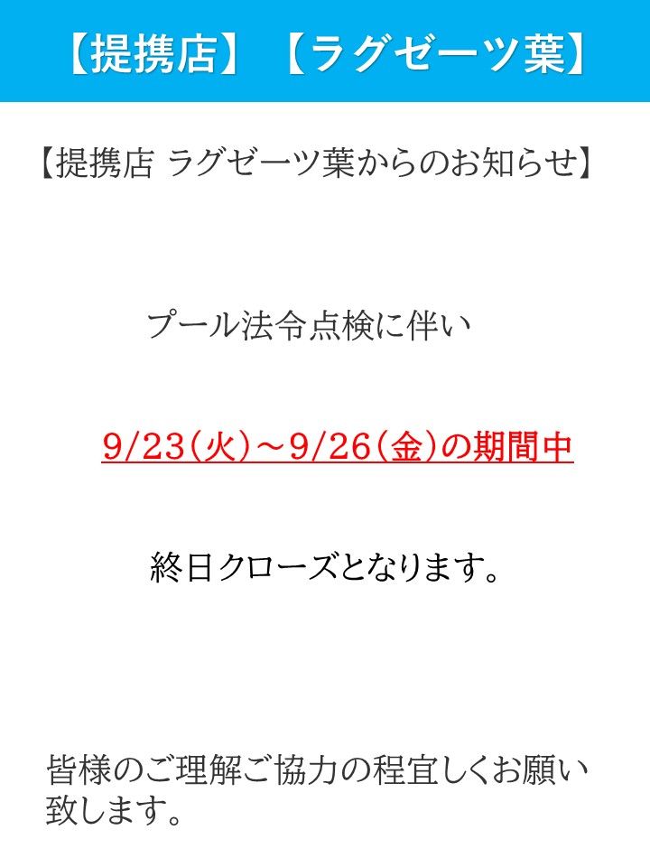 インフォメーション 2025.09.15 お知らせ会員様へのご案内提携サービス 【提携店】【ラグゼ一ツ葉 プール】法令点検によるクローズ期間のご案内 前の記事へ 次の記事へ 記事一覧へ戻る NEWS 【2025年09月27日】フリーウェイトエリアを大幅に拡充! 【2025年09月15日】【提携店】【ラグゼ一ツ葉 プール】法令点検によるクローズ期間のご案内 【2025年07月01日】☆ 提携施設・提携サービス ☆ 【2025年07月01日】【マシン増設リニューアルに伴う臨時休館日及びスタジオのみ営業のご案内】 【2025年06月01日】【提携サービス】ミヤチク様 提携サービス終了のお知らせ 一覧を見る SOCIAL INFORMATIONフォローしてお得な情報をゲットしよう。 ワウディー宮崎