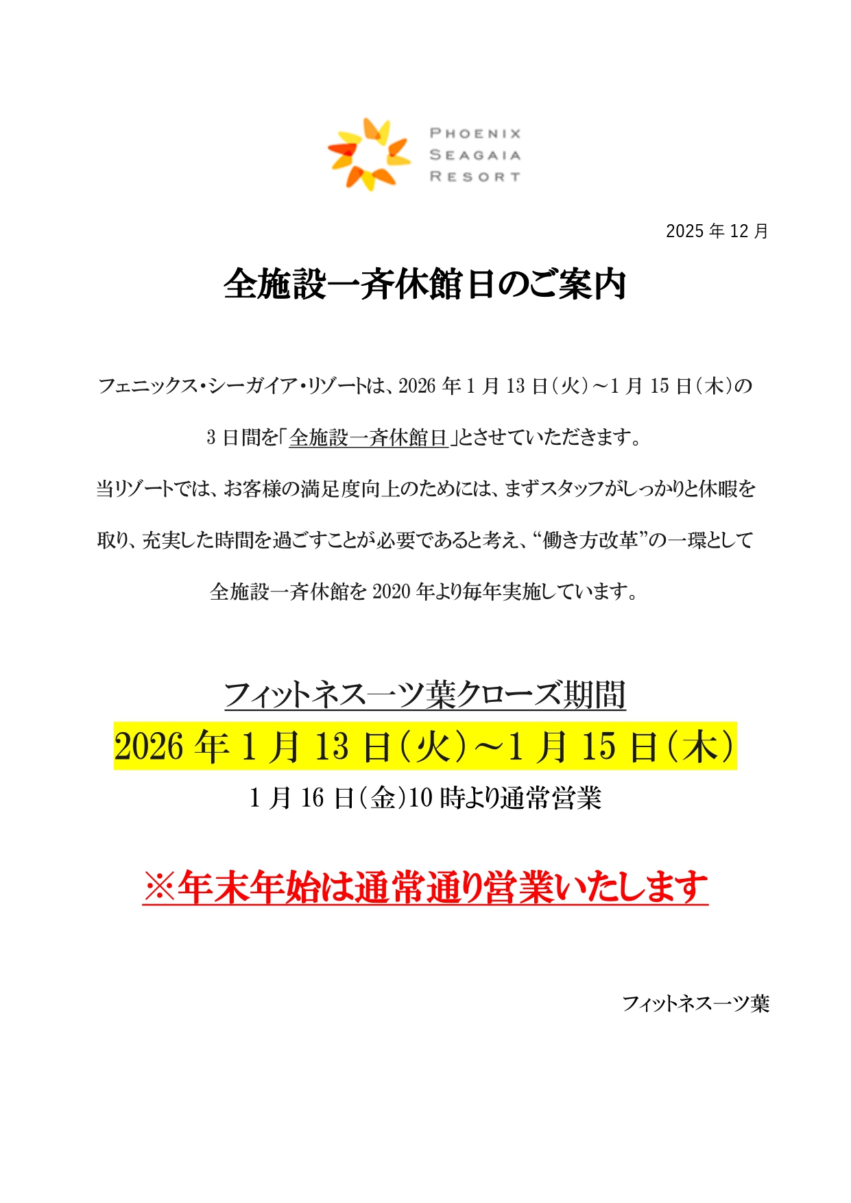 インフォメーション 2025.12.22 お知らせ提携サービス 【提携店】ラグゼ一ツ葉 プール 1月休館日のご案内 前の記事へ 記事一覧へ戻る NEWS 【2025年12月22日】【提携店】ラグゼ一ツ葉 プール 1月休館日のご案内 【2025年12月01日】【ワウディープラス宮崎ナナイロ マシン入替リニューアルに伴う臨時休館日のご案内】 【2025年11月13日】【年末年始休館のお知らせ】 【2025年09月27日】フリーウェイトエリアを大幅に拡充! 【2025年09月15日】【提携店】【ラグゼ一ツ葉 プール】法令点検によるクローズ期間のご案内 一覧を見る SOCIAL INFORMATIONフォローしてお得な情報をゲットしよう。 ワウディー宮崎