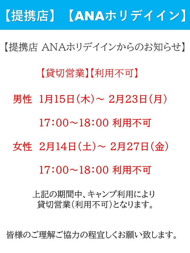 インフォメーション 2026.01.10 お知らせ会員様へのご案内 【提携店】ANAホリデイ・イン リゾート 貸切営業時間のお知らせ 前の記事へ 記事一覧へ戻る NEWS 【2026年01月10日】【提携店】ANAホリデイ・イン リゾート 貸切営業時間のお知らせ 【2025年12月22日】【提携店】ラグゼ一ツ葉 プール 1月休館日のご案内 【2025年12月01日】【ワウディープラス宮崎ナナイロ マシン入替リニューアルに伴う臨時休館日のご案内】 【2025年11月13日】【年末年始休館のお知らせ】 【2025年09月27日】フリーウェイトエリアを大幅に拡充! 一覧を見る SOCIAL INFORMATIONフォローしてお得な情報をゲットしよう。 ワウディー宮崎